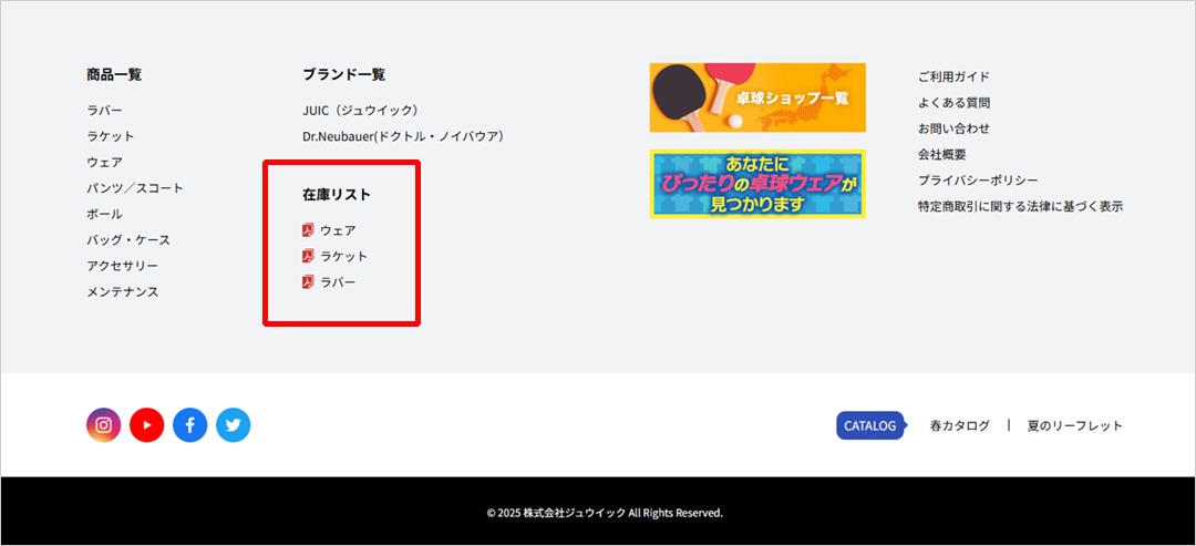 - 一部の卓球専門店やスポーツショップにて無料で配布しています。まずはお近くの販売店にお取り扱い状況をご確認くださいませ。また、当社のウェブサイトではデジタルカタログもご覧いただけます。こちらのリンクからご確認ください。(カタログはこちら)